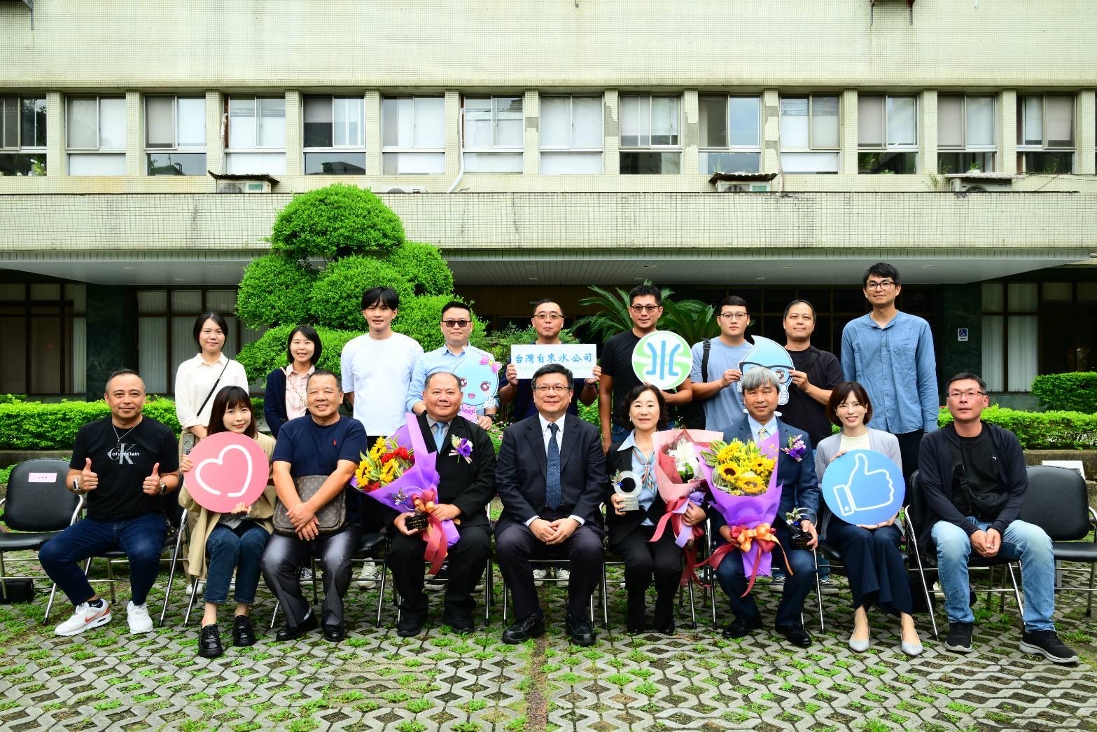 ▲經濟部部長龔明鑫、次長賴建信、台水公司總經理李丁來、本會理事長董季琪、台水公司模範公務人員工務處處長楊人仰、花蓮給水廠廠長吳文祥與本會幹部及會員合影