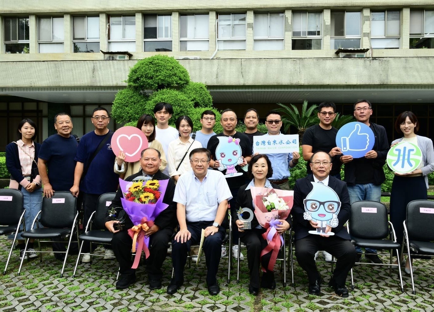 ▲經濟部司長胡文中、台水公司總經理李丁來、本會理事長董季琪、台水公司模範公務人員工務處處長楊人仰、花蓮給水廠廠長吳文祥與本會幹部及會員合影
